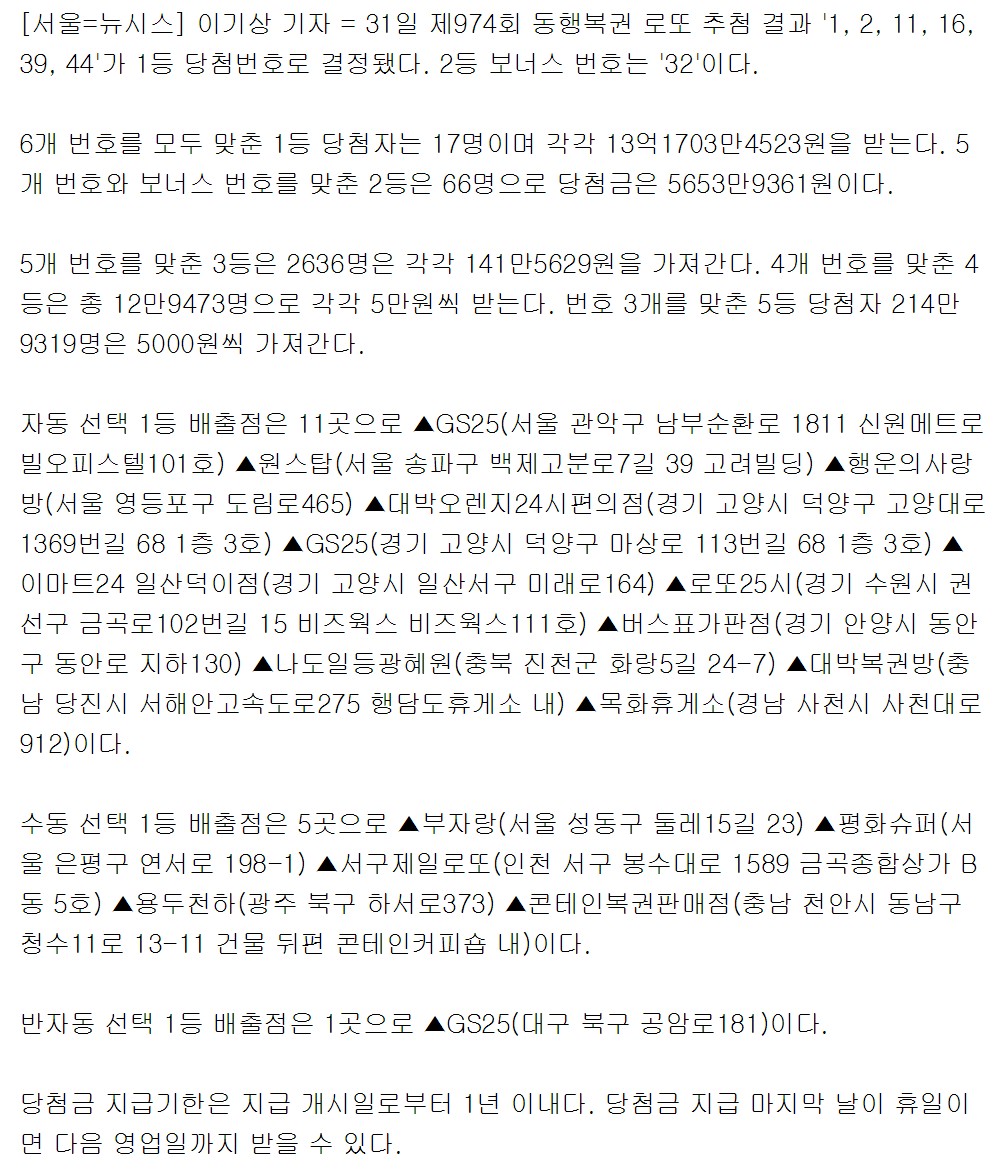 제974회 로또 1등 17명→13억씩…11명 자동선택 옥토102021-08-01 01:43:50