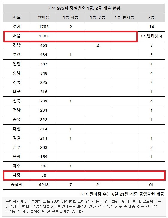 로또 975회 당첨번호 1등 9명···'수동 배출점 두 곳 묘하네'
