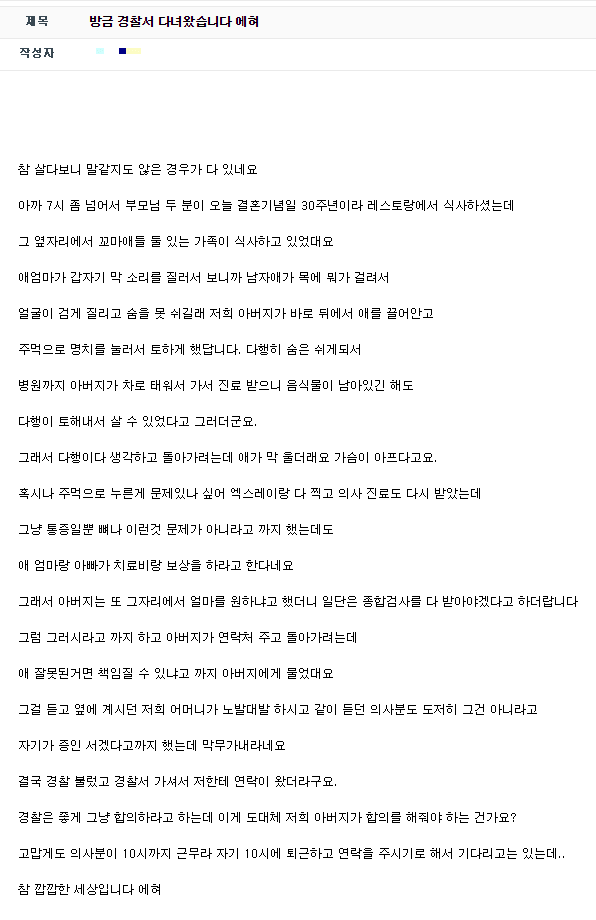 음식 목에 걸려 죽을 뻔했던 거 살려냈더니 신고당한 썰
