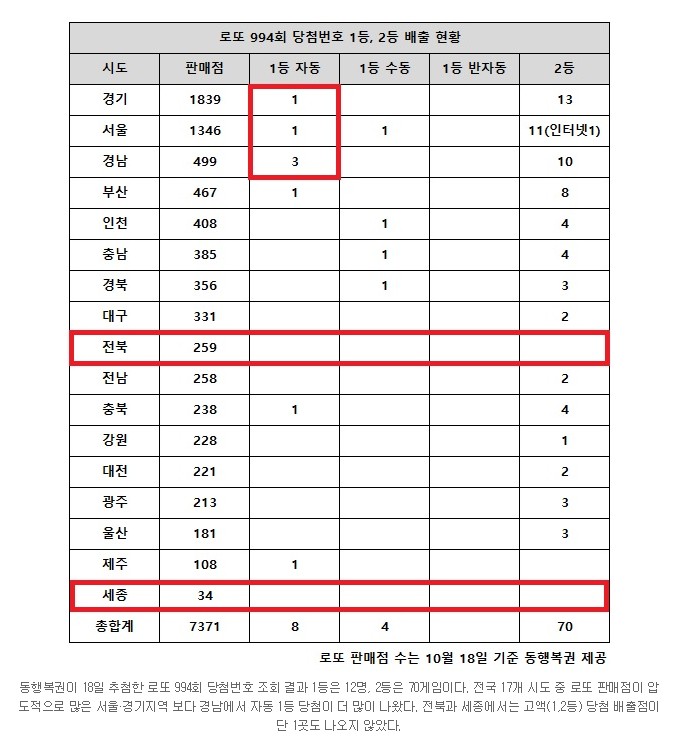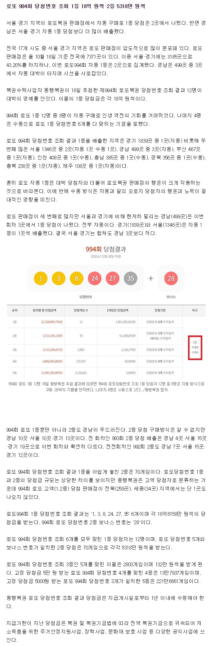 로또 994회 당첨번호 1등 12명…'서울·경기 합쳐도 밀리네' 나일롱2021-12-20 13:09:59