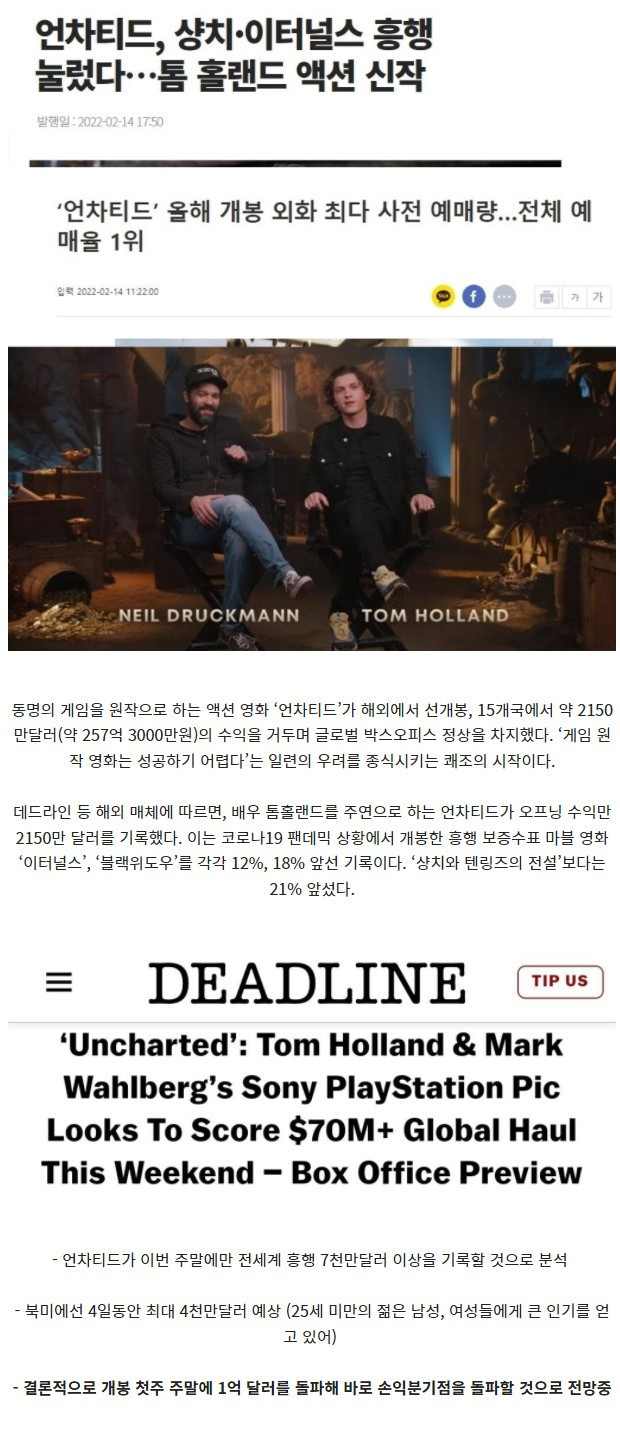톰홀랜드 주연 언차티드 영화 흥행 근황