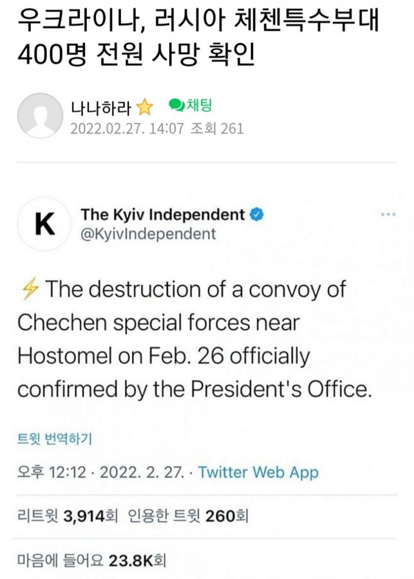 러시아 체첸 특수부대 400명 전원 사살 확인 아트732022-03-02 15:07:37