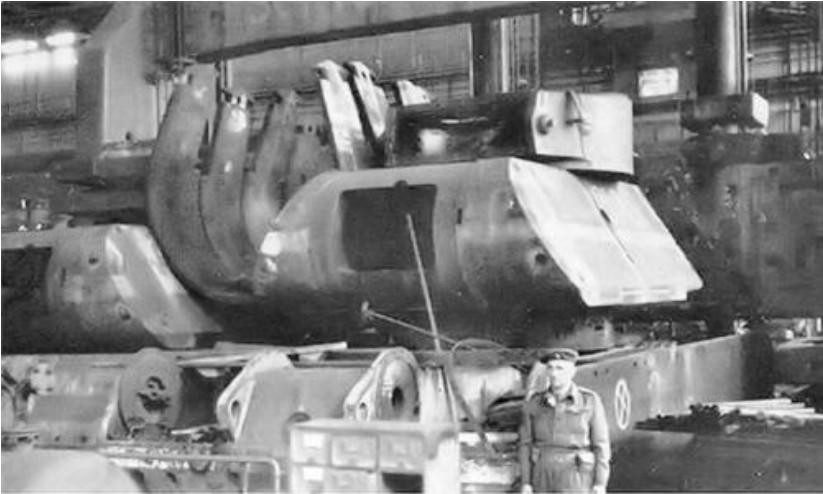 종전후 크루프(Krupp)사의 마우스 생산라인을 조사중인 영국군 장교와 생산 중단된 마우스 차체 4대. 타이거의 포탑과 비교해 마우스 포탑의 크기를 잘 알 수 있는 사진이다.
