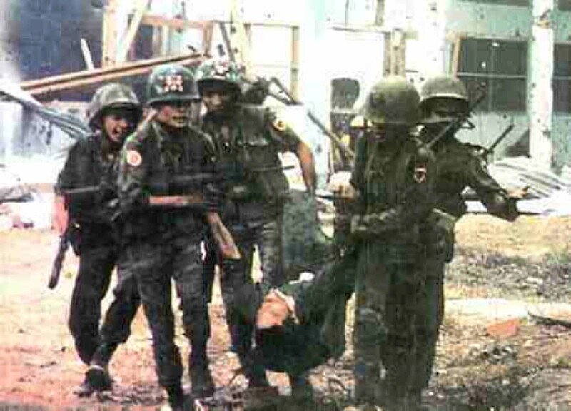 베트콩 대원을 걷어차는 남베트남 병사 베트남전쟁을 상징하는 사진 중 하나임.
