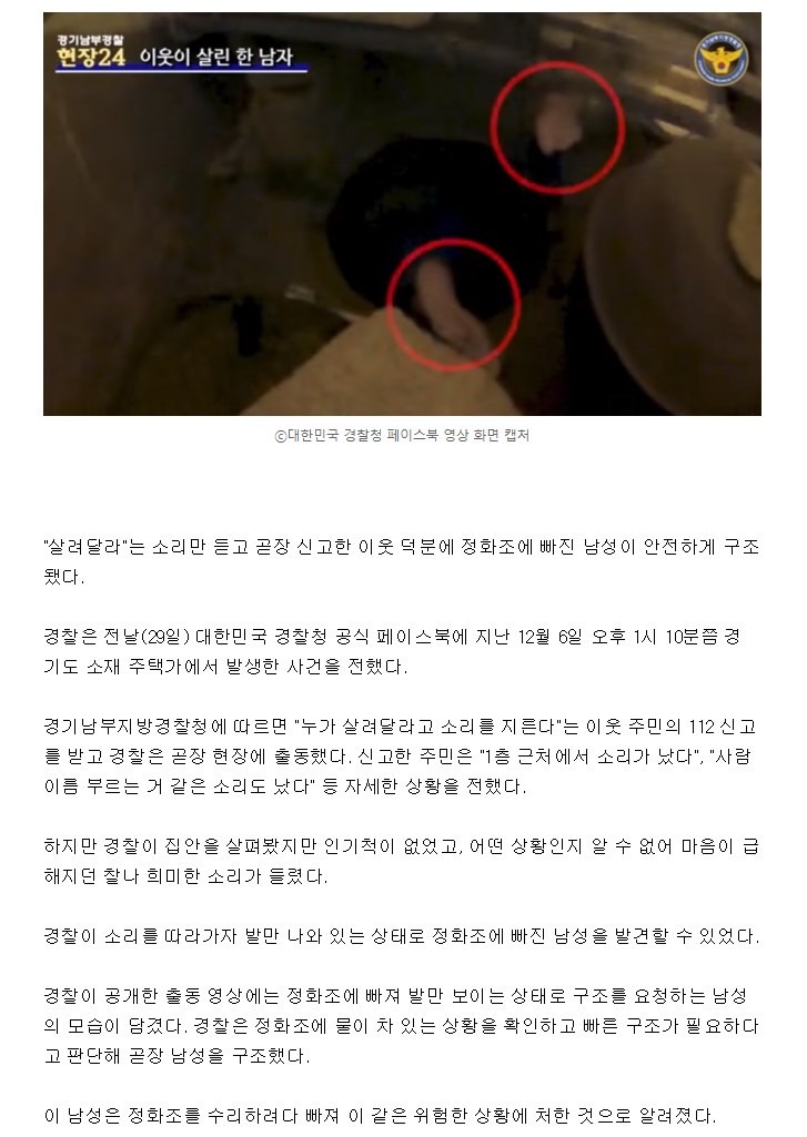발만 나온 상태로 정화조에 빠져있던 남성 이웃 신고로 구조 옥토102020-12-30 11:37:39