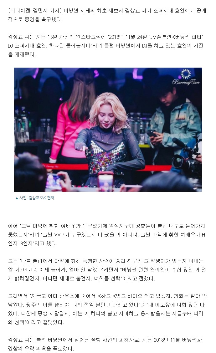 '버닝썬' 김상교, 효연 소환 왜? "약에 취한 여배우 누구냐"